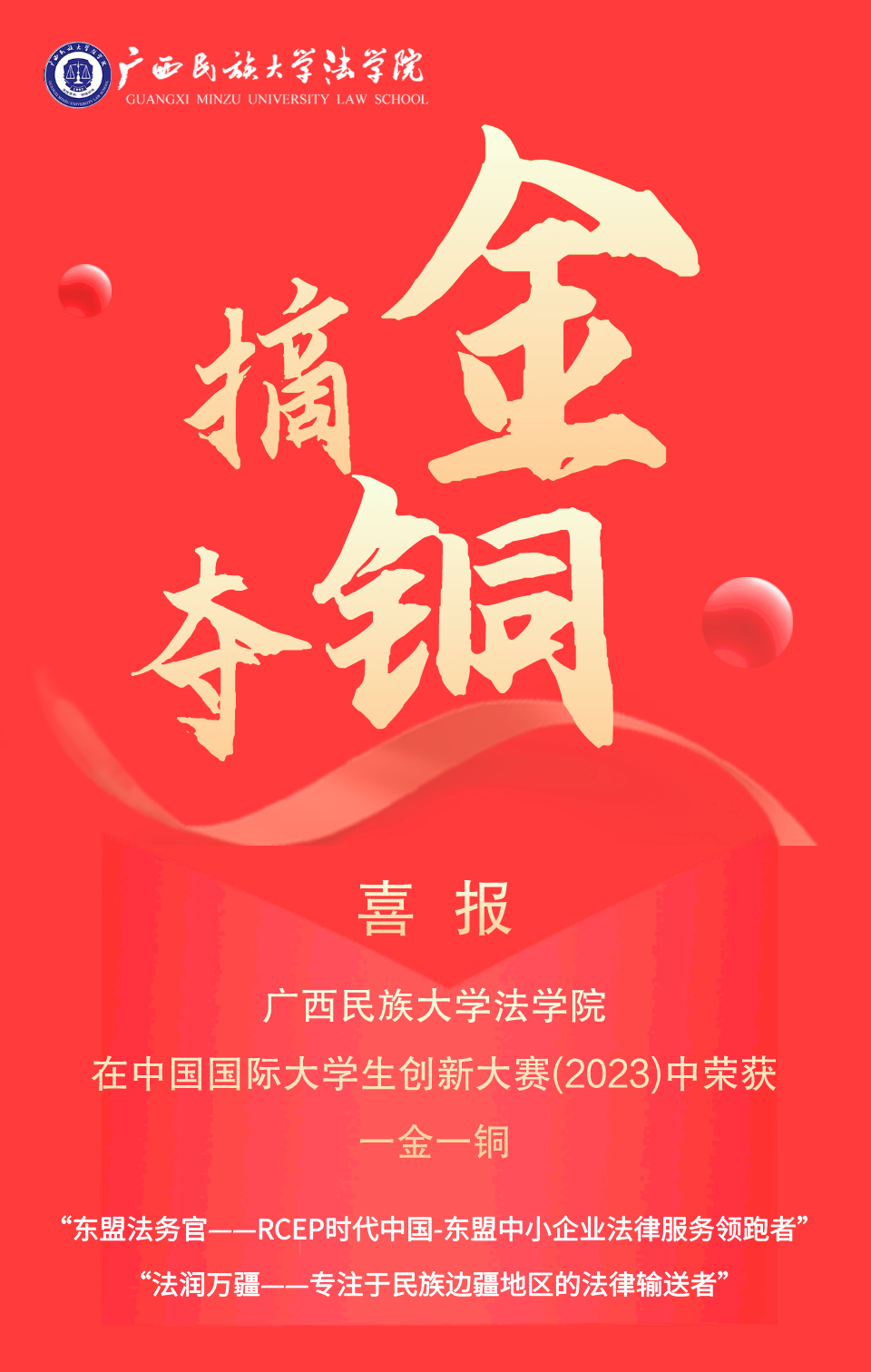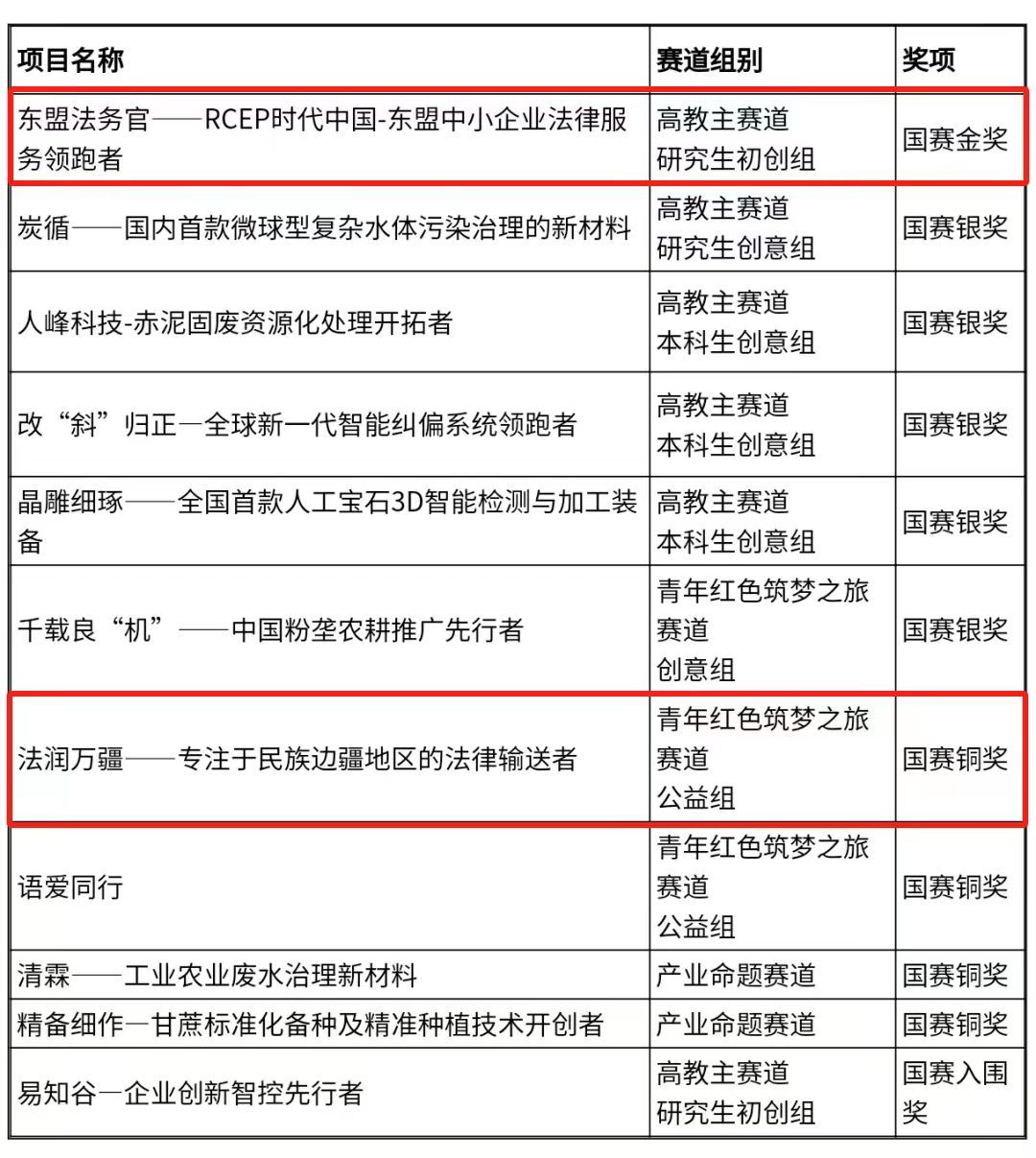 中国国际大学生创新大赛(2023)由教育部等12个部门会同天津市人民政府主办,天津大学承办。今年共有来自国内外151个国家和地区5296所学校的421万个项目、1709万人次报名参赛,1260个优秀项目脱颖而出。我院“东盟法务官——RCEP时代中国-东盟中小企业法律服务领跑者”斩获高教主赛道研年红色筑梦之旅赛道公益组国赛铜奖。