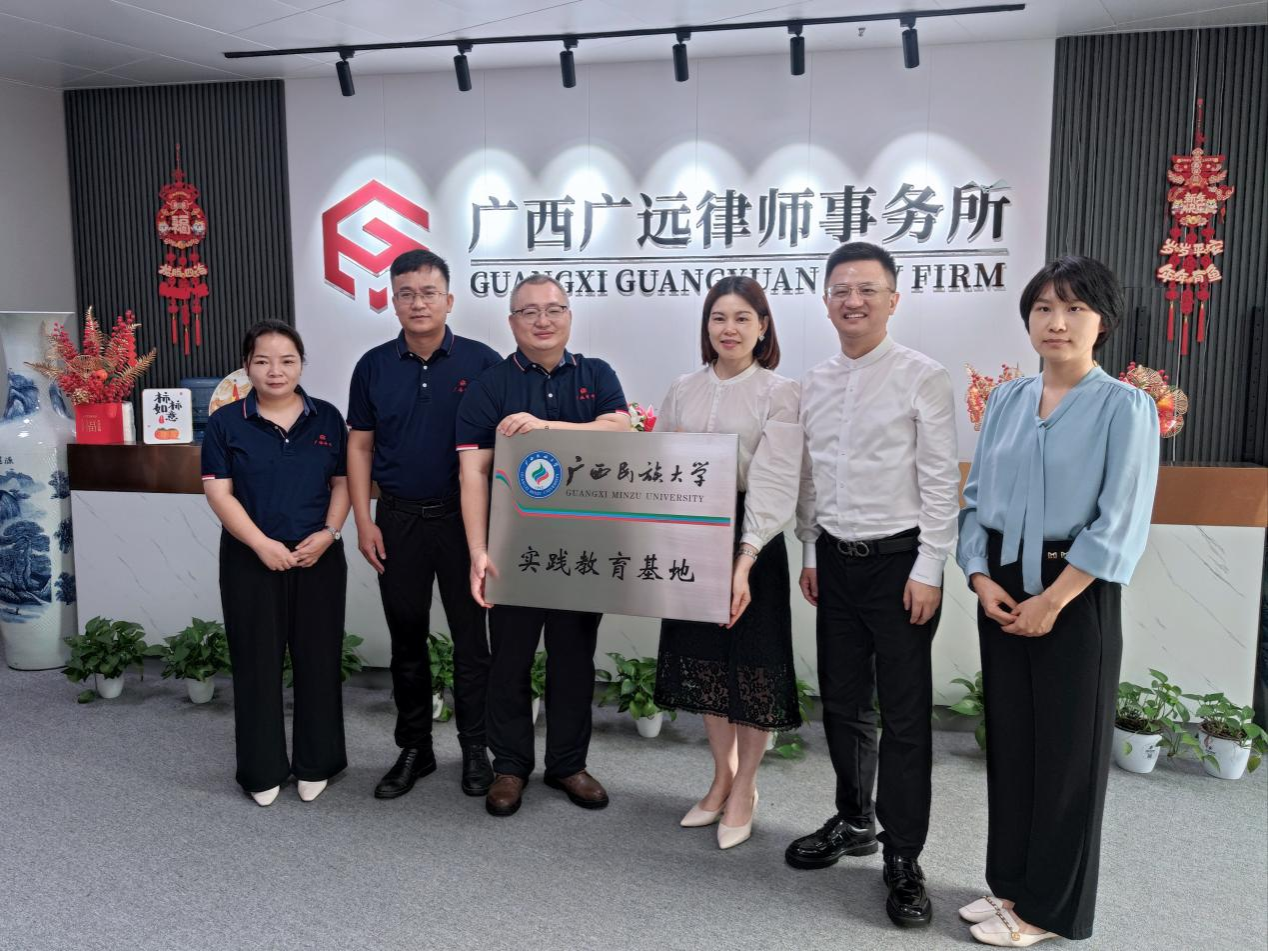 近日,我院赴广西广远律师事务所开展新一轮广西民族大学实践教育基地授牌。学院党委副书记玉琳、副院长陈星,广西广远律师事务所党支部书记、主任张相羽,执行主任王艳,副主任黄志基等双方代表参加仪式。