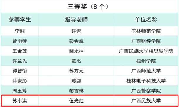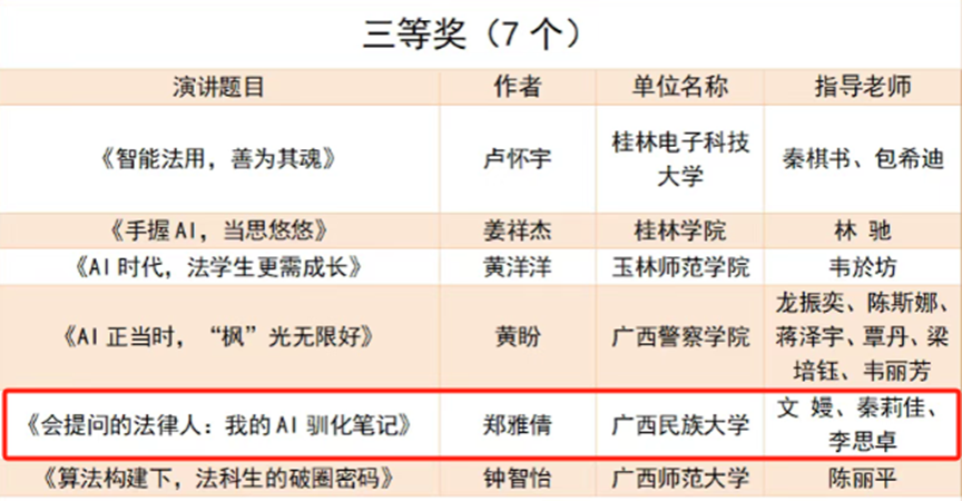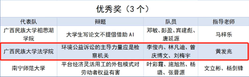 【简讯】5月10日,广西高校第七届“八桂法声”法学专业辩论赛、广西高校第四届“八桂法声”法学专业演讲比赛和广西高校第三届法律文书写作竞赛在广西警察学院开赛,我院师生组队参赛并取得演讲比赛一等奖、三等奖,法律文书写作技能比赛三等奖、优秀奖,辩论赛优秀奖的优异成绩。(通讯员:指导老师秦莉佳、李思卓、崔璀、黄发兆)
