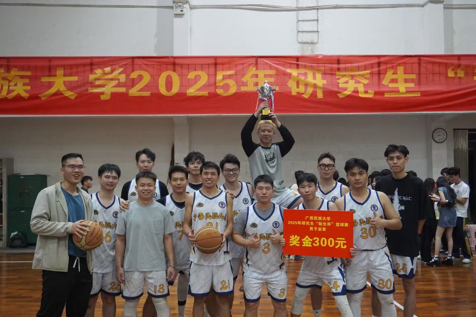 2025年10月10日至10月25日,广西民族大学2025年研究生“新生杯”篮球赛在大丰体育馆进行,我院研究生男子篮球队奋勇拼搏、团结一心,最终得到男子组亚军。(简讯:司徒丽山)
